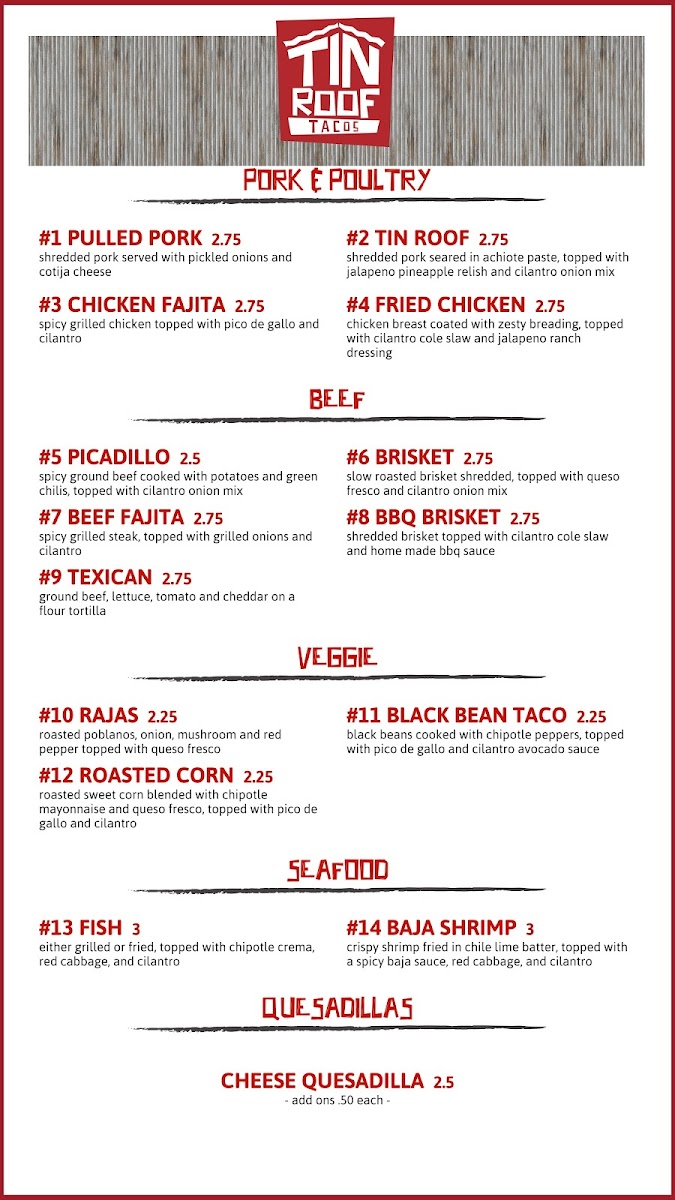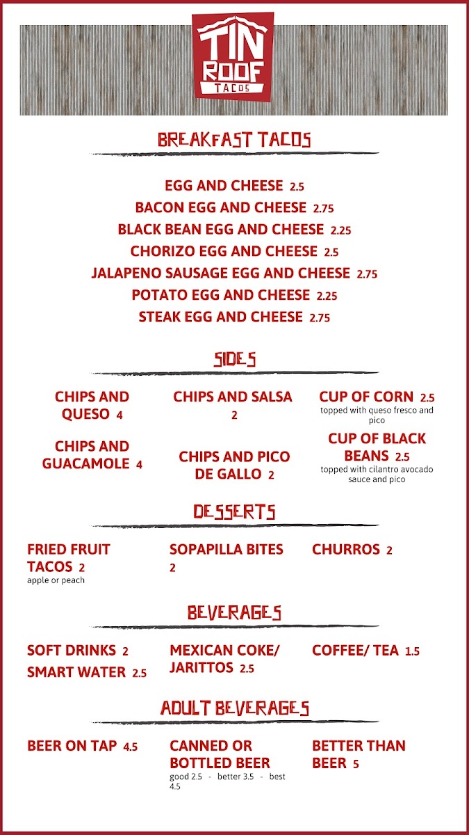 Welcome to Tin Roof Tacos, your next favorite taco destination located at 1750 W McMillan Rd in Meridian, ID. Known for its vibrant atmosphere and community feel, Tin Roof Tacos offers a diverse menu that caters to all palates. Start your day right with a tempting breakfast selection, featuring options like the Steak Egg and Cheese and the crowd-pleasing Chorizo Egg and Cheese, all priced affordably under $3.